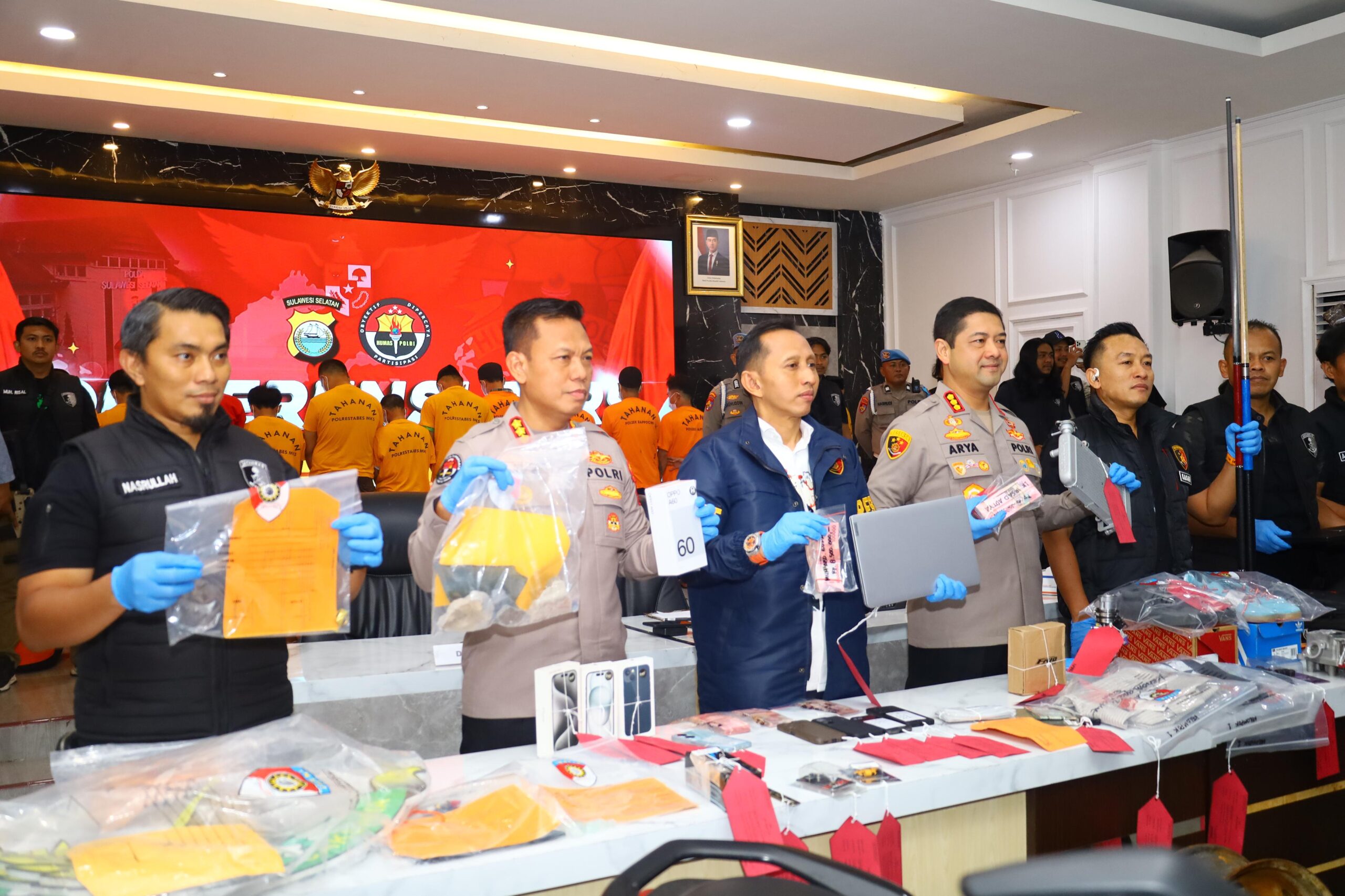 Kepolisian Daerah Sulawesi Selatan (Polda Sulsel) bersama Polrestabes Makassar menggelar konferensi pers terkait pengungkapan kasus tindak pidana pembakaran, pengerusakan, pencurian, serta penganiayaan yang terjadi saat aksi unjuk rasa di sejumlah wilayah Sulawesi Selatan.